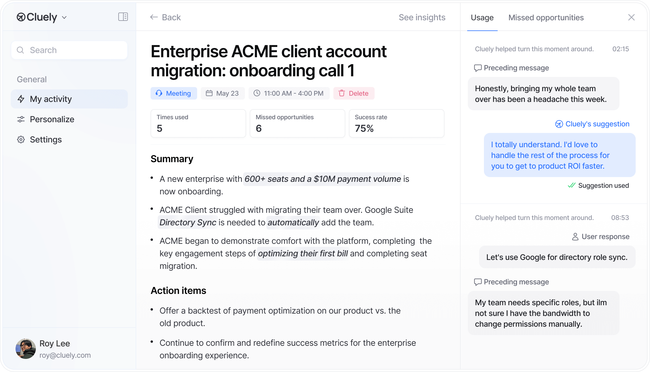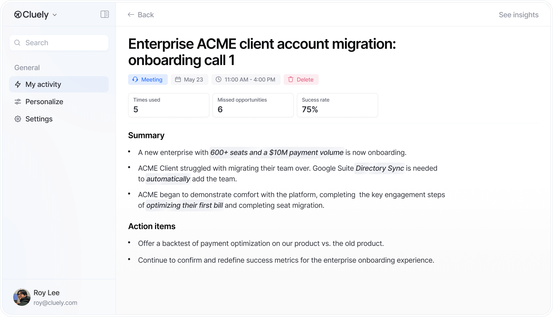 Usage analytics.View detailed AI meeting analytics to identify top reps and areas for improvement.