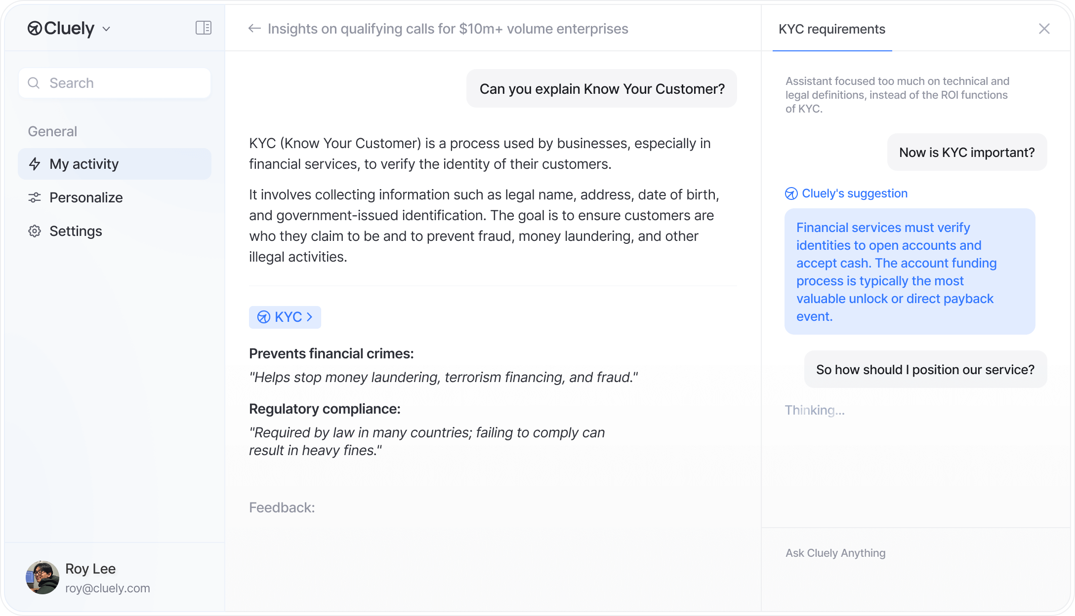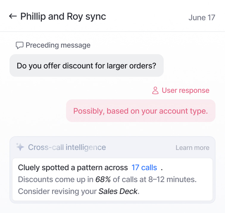 Cluely dynamically suggests questions to ensure you never miss a beat with a prospect.