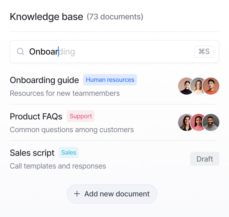 Shared team knowledge bases.Centralize prompts and documents reps can access instantly.