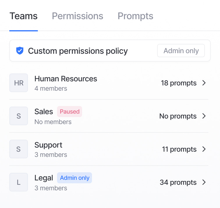 Team-level settings & permissions.Organize users into teams with custom prompts and controls for tailored use.